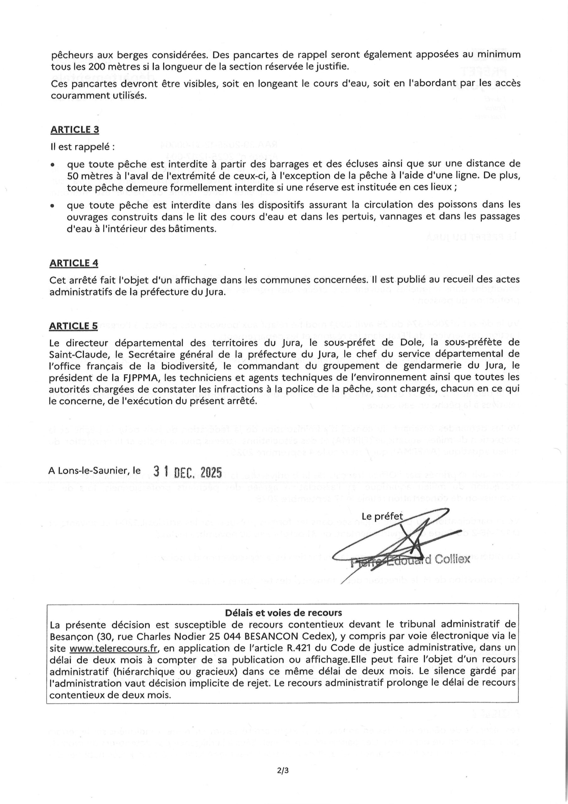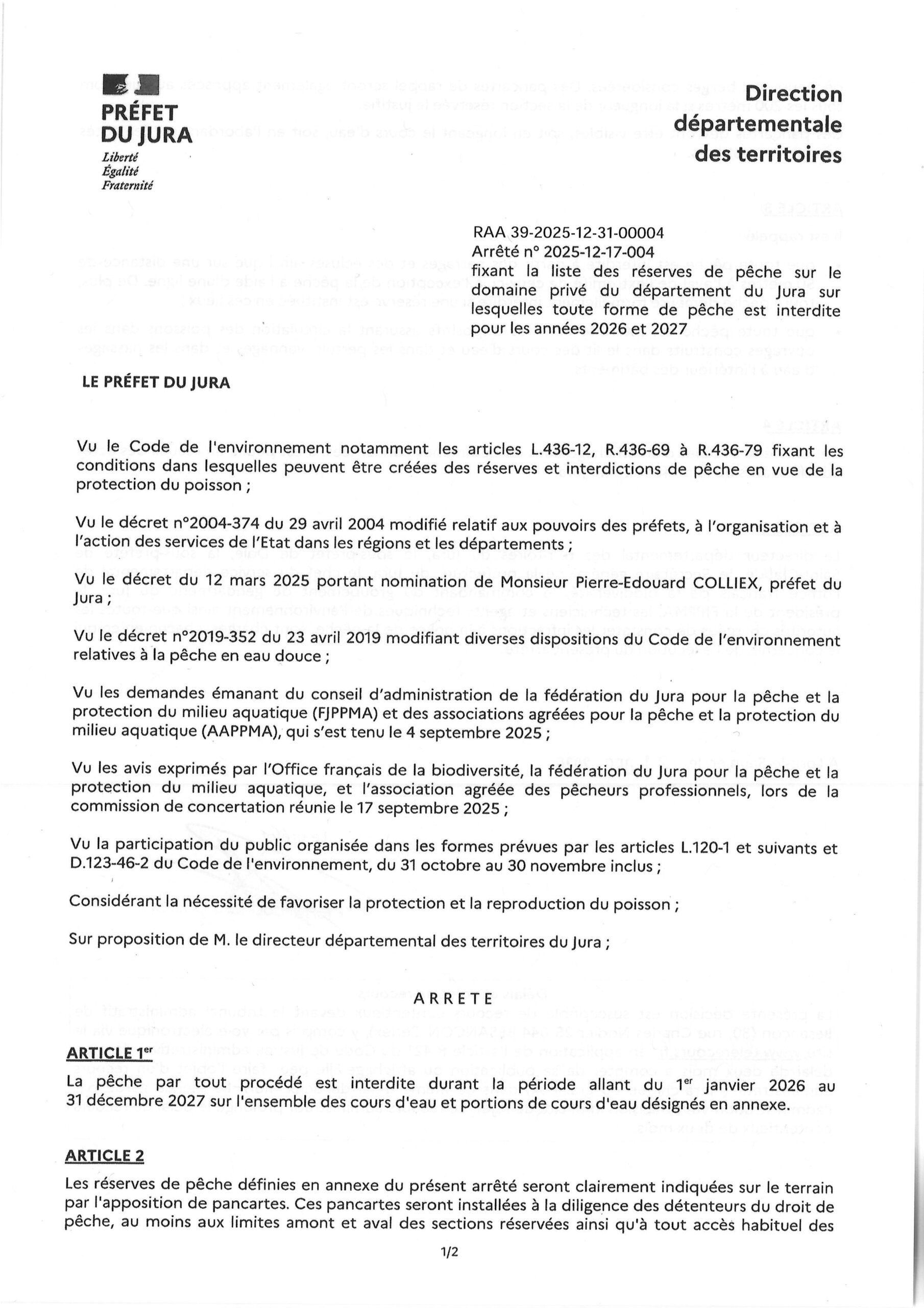 Accueil Actualités Arrêté préfectoral « Liste des réserves de pêche sur le domaine privé du département du Jura. » Arrêté préfectoral « Liste des réserves de pêche sur le domaine privé du département du Jura. » Informations Publié le 16/01/2026 Partager sur les réseaux Partager sur Facebook Partager par mail Copier le lien Article précédent «Arrêté préfectoral « Pêche de la carpe pour l’année 2026 »» Retour