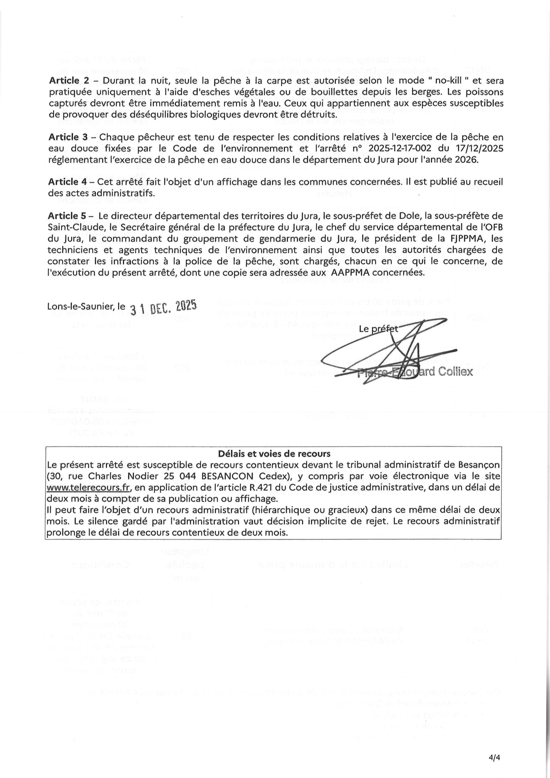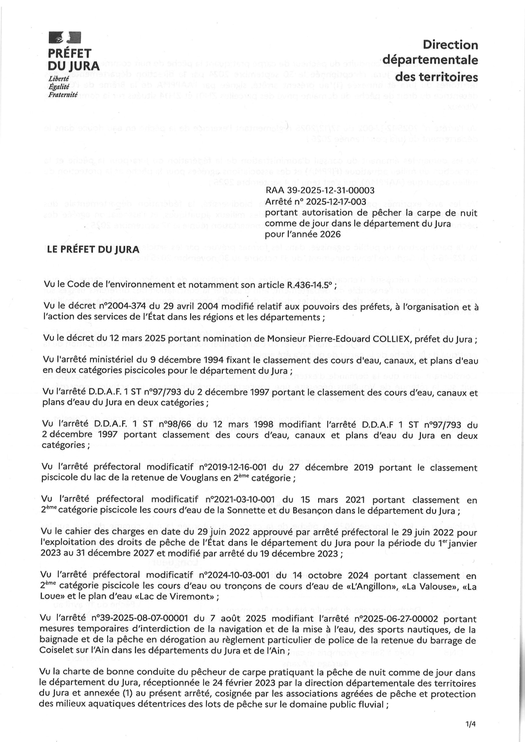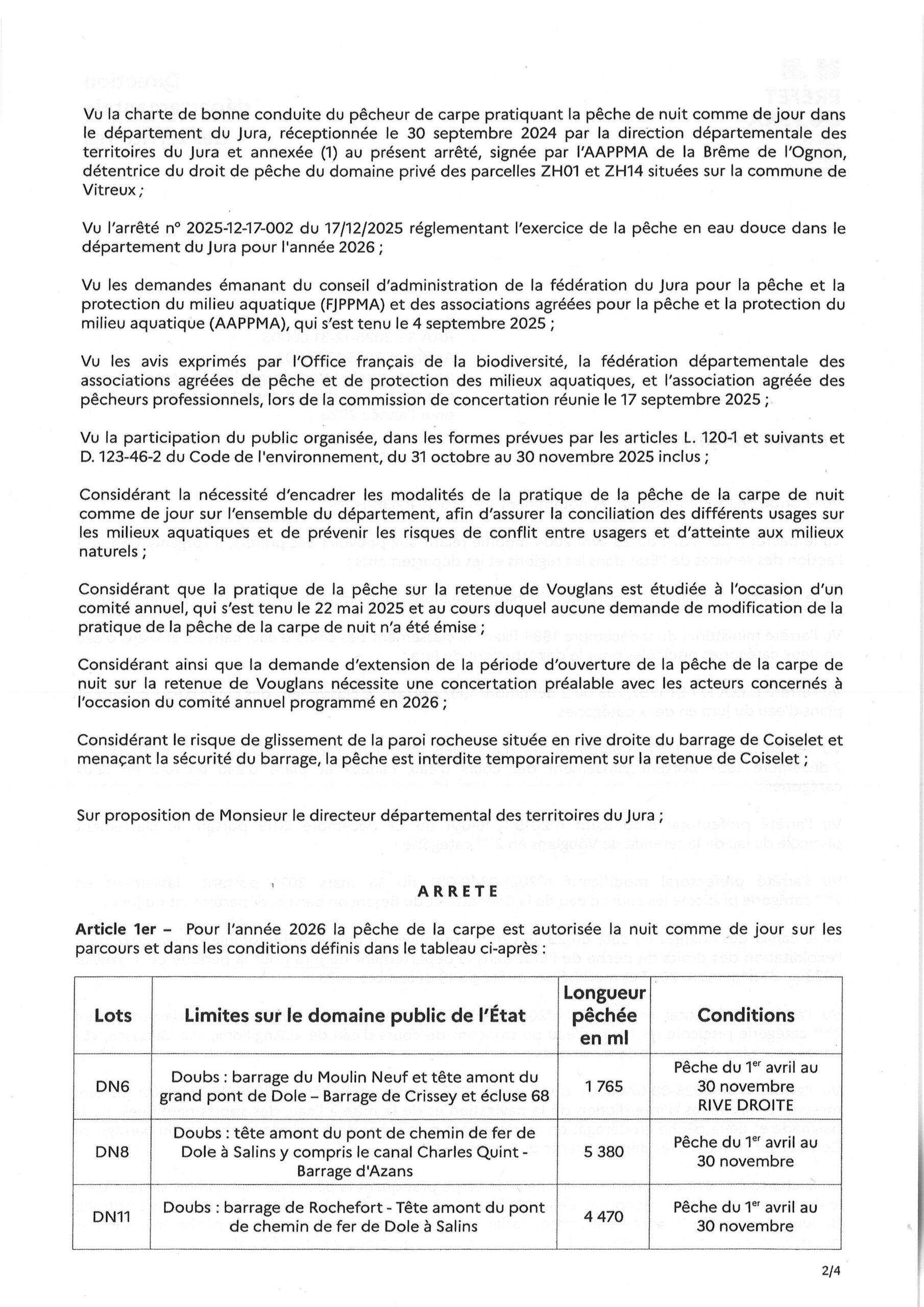 Accueil Actualités Arrêté préfectoral « Pêche de la carpe pour l’année 2026 » Arrêté préfectoral « Pêche de la carpe pour l’année 2026 » Informations Publié le 16/01/2026 Partager sur les réseaux Partager sur Facebook Partager par mail Copier le lien Article précédent «Arrêté préfectoral « Pêche en eau douce pour l’année 2026 »» Retour Article suivant «Arrêté préfectoral « Liste des réserves de pêche sur le domaine privé du département du Jura. »»