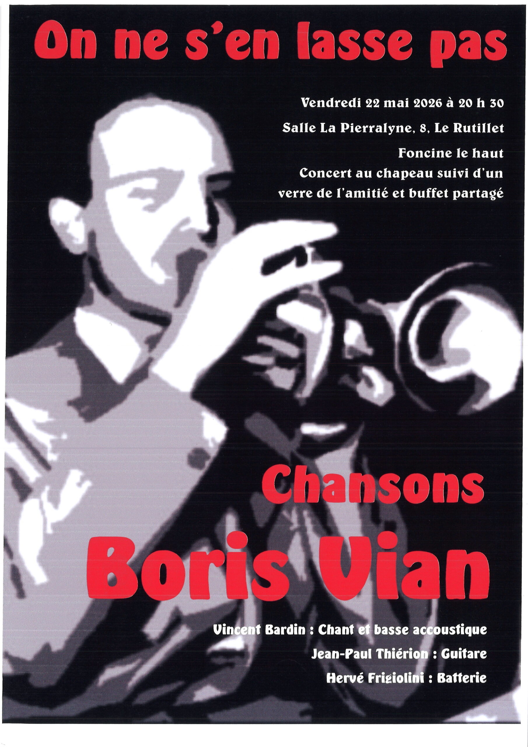 Accueil Actualités Boris VIAN Boris VIAN Animations Publié le 24/04/2026 Partager sur les réseaux Partager sur Facebook Partager par mail Copier le lien La Pierralyne Vendredi 22 mai 2026 à 20h30 Article précédent «Racines Bleues» Retour