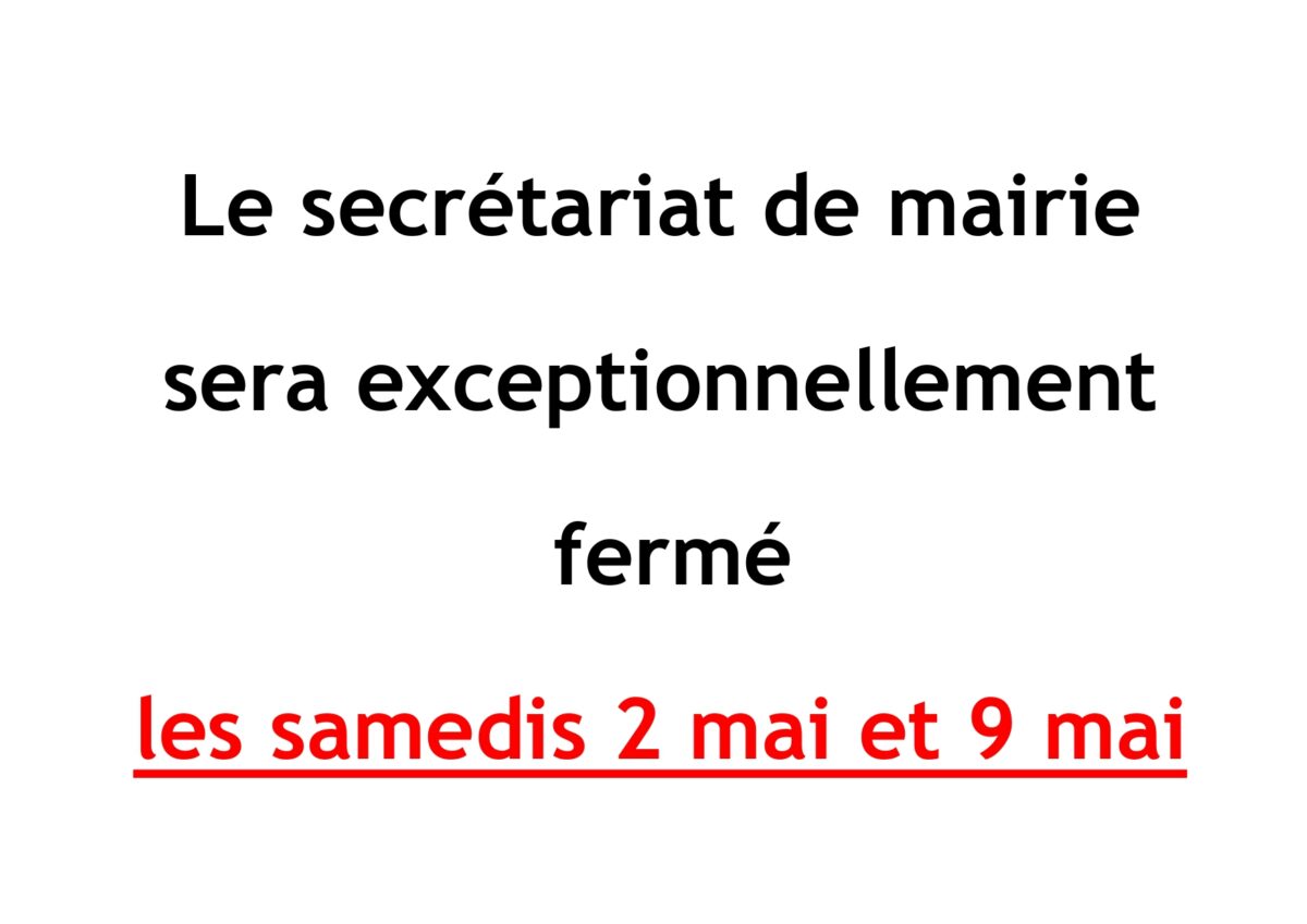 Accueil Actualités Fermeture du secrétariat de mairie. Fermeture du secrétariat de mairie. Informations Publié le 23/04/2026 Partager sur les réseaux Partager sur Facebook Partager par mail Copier le lien Article précédent «Permanence par Info Jeunes Jura.» Retour Article suivant «Racines Bleues»