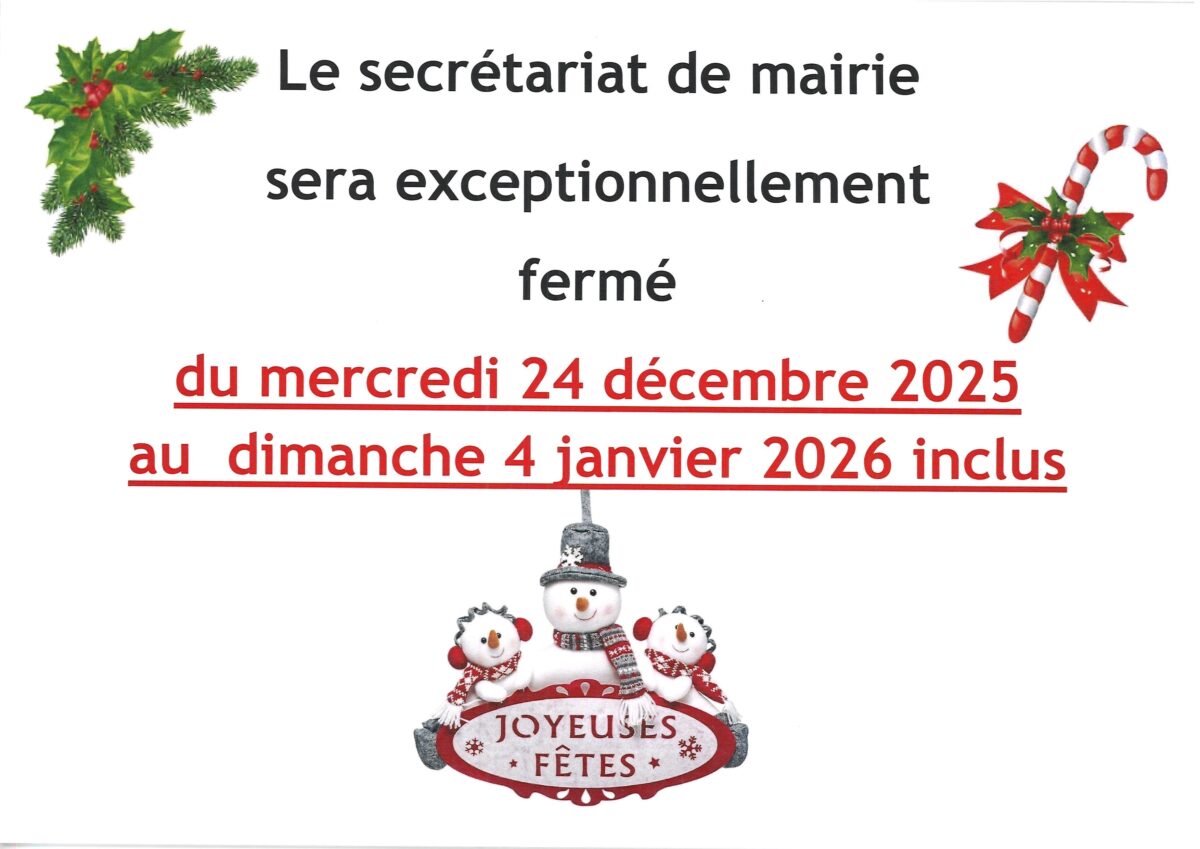 Accueil Actualités Fermeture secrétariat de mairie Fermeture secrétariat de mairie Informations Publié le 15/12/2025 Partager sur les réseaux Partager sur Facebook Partager par mail Copier le lien Secrétariat de mairie fermé du 24/12/2025 au dimanche 04/01/2026 inclus Article précédent «Arrêté préfectoral « Protoxyde d’azote »» Retour