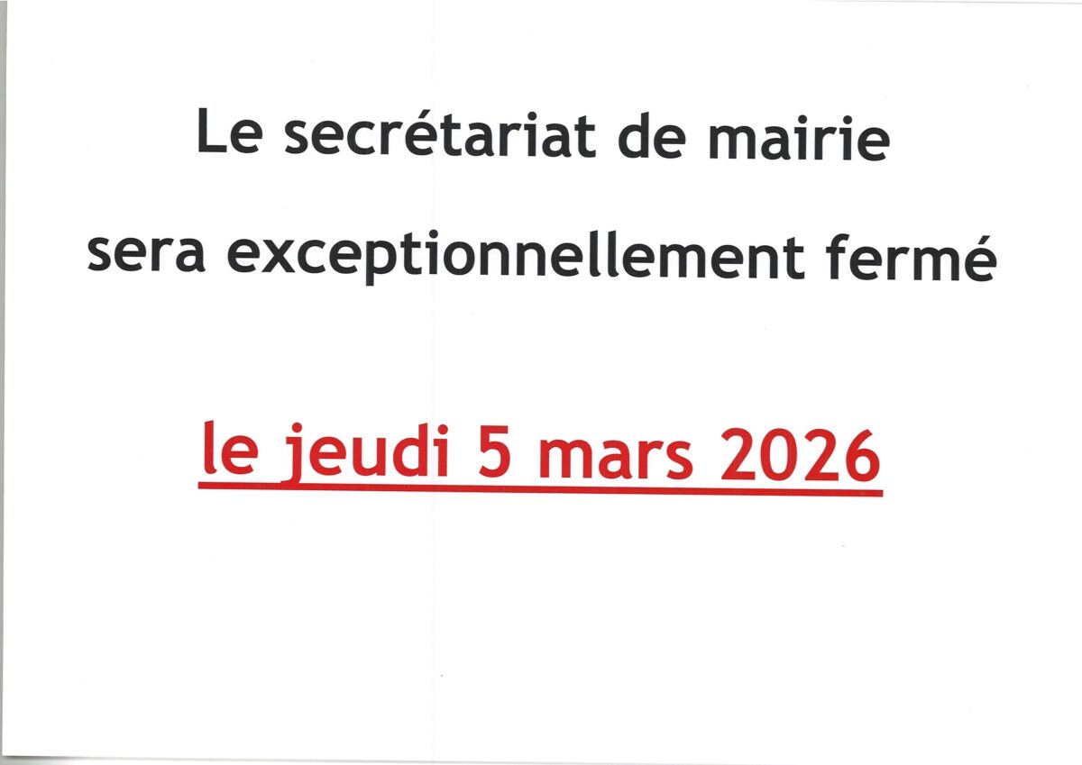 Accueil Actualités Fermeture secrétariat de mairie Fermeture secrétariat de mairie Informations Publié le 26/02/2026 Partager sur les réseaux Partager sur Facebook Partager par mail Copier le lien Secrétariat de mairie fermé le 5 mars 2026 Article précédent «Nouveau médecin : VUILLET Jeanne» Retour