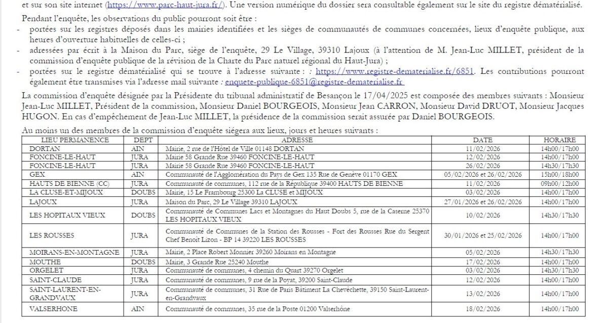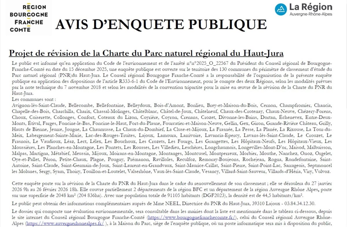 Accueil Actualités Avis d’enquête Publique Avis d’enquête Publique Informations Publié le 08/01/2026 Partager sur les réseaux Partager sur Facebook Partager par mail Copier le lien Projet de révision de la Charte du Parc naturel régional du Haut-Jura Article précédent «Avis de dépôt permis de construire.» Retour Article suivant «NORDIC NIGHTS 2026»