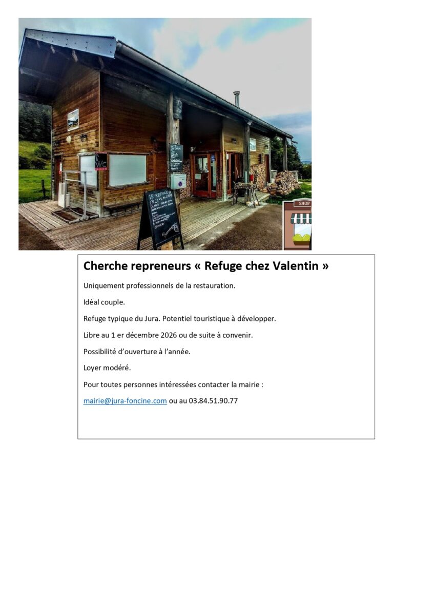 Accueil Actualités Le Refuge Chez Valentin : cherche repreneurs Le Refuge Chez Valentin : cherche repreneurs Informations Publié le 09/04/2026 Partager sur les réseaux Partager sur Facebook Partager par mail Copier le lien Article précédent «VAL FONCINE TRAIL : appel à bénévoles» Retour