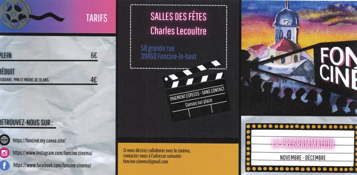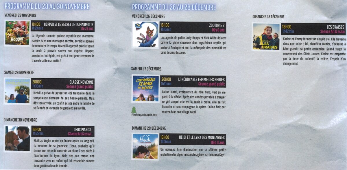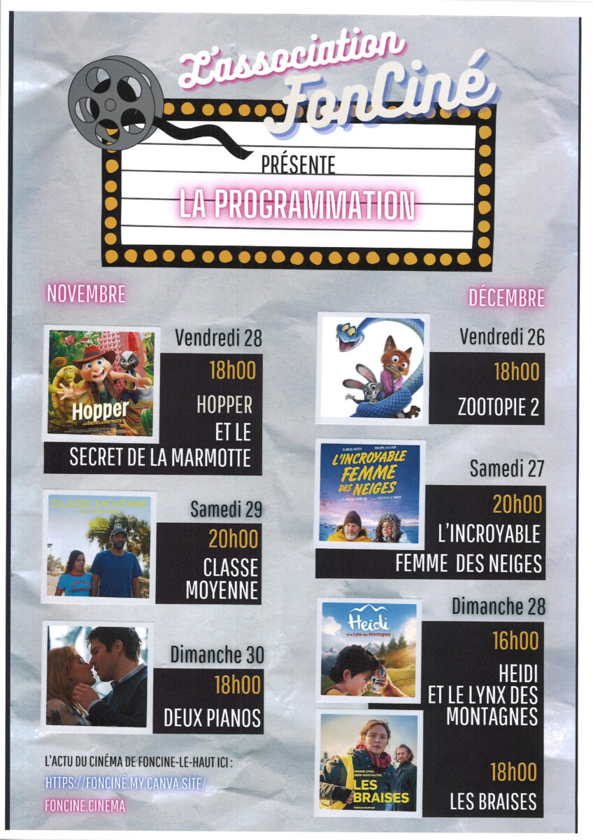 Accueil Actualités Cinéma Cinéma AnimationsCinéma Publié le 24/11/2025 Partager sur les réseaux Partager sur Facebook Partager par mail Copier le lien Salle des fêtes de Foncine-le-Haut Article précédent «Fusion ASA Pré Audin et Rocheret» Retour Article suivant «Le Grand Jeu de Noël»