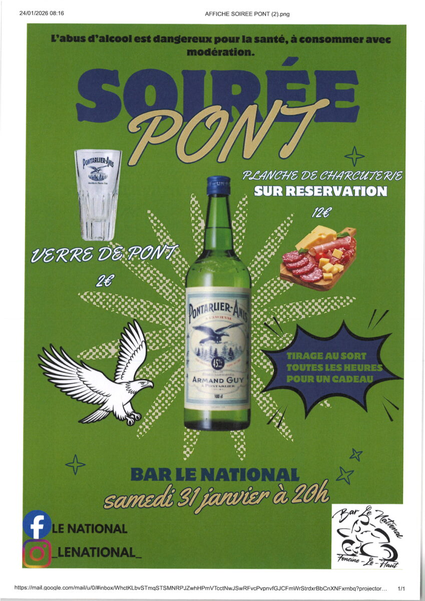 Accueil Actualités Soirée Pontarlier Soirée Pontarlier Animations Publié le 24/01/2026 Partager sur les réseaux Partager sur Facebook Partager par mail Copier le lien Samedi 31 janvier à 20h Article précédent «Autorisation de franchissement de cours d’eau pour travaux de débardage.» Retour Article suivant «Appartement neuf à louer.»